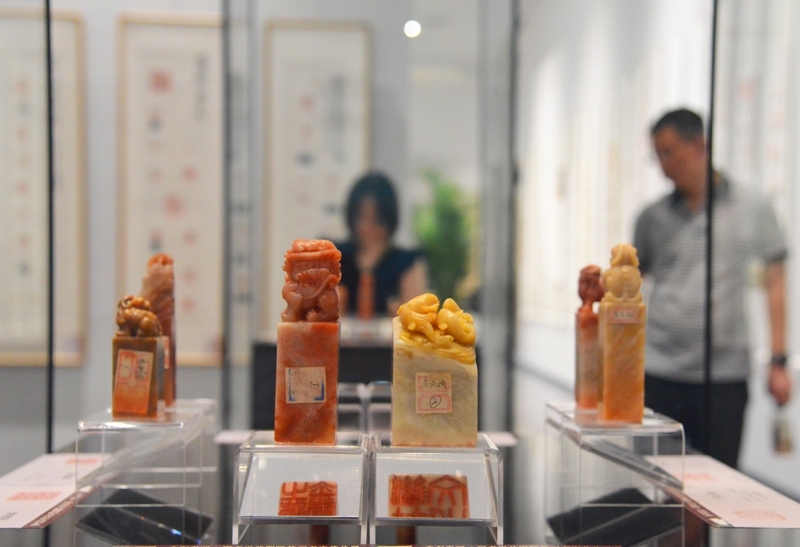 6月21日,觀眾在北京市海淀區(qū)三山五園文化藝術(shù)中心參觀薪傳國粹——“萬印樓”新藏當(dāng)代國際篆刻精品展。