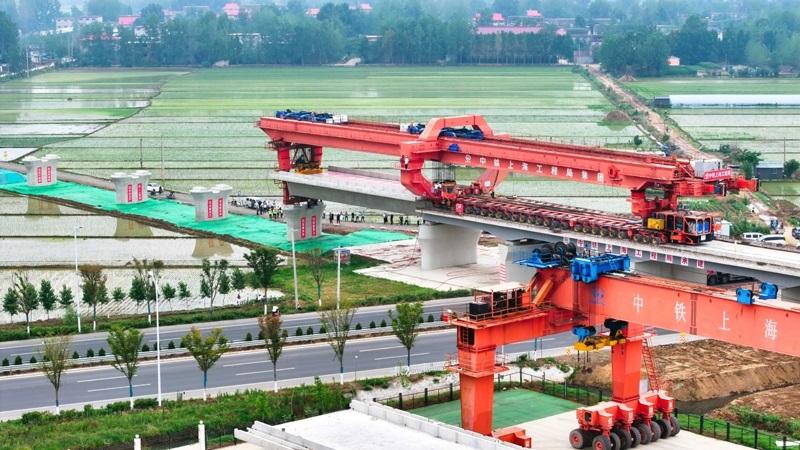 6月21日,在濰宿高鐵中鐵上海局郯城制梁場,提梁機在提運箱梁(無人機照片)。