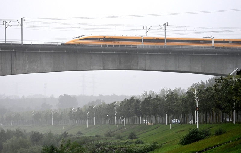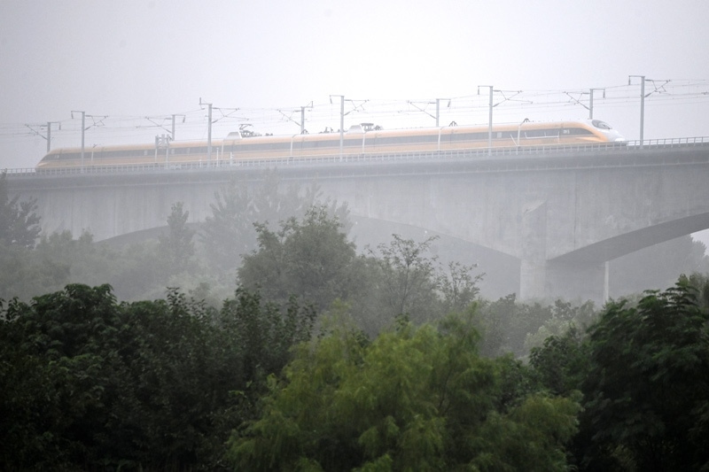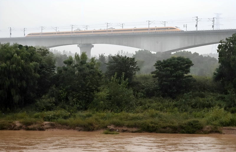 9月11日,聯(lián)調(diào)聯(lián)試綜合檢測(cè)列車駛過位于陜西省西安市的西延高鐵渭河特大橋。