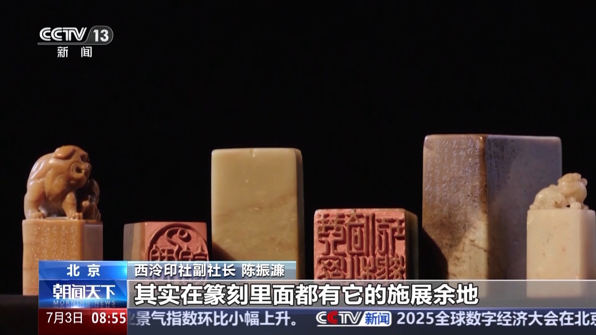 西泠印社副社長(zhǎng) 陳振濂:或者是流暢的,或者是坎坷的,各種各樣的線條,其實(shí)在篆刻里面都有它的施展余地。一起一伏一頓一挫里面都是生命的脈動(dòng)。