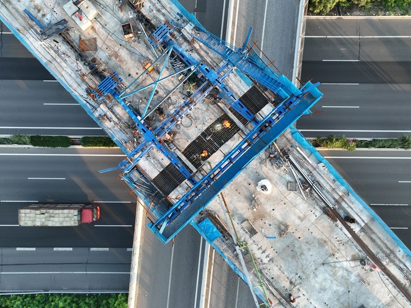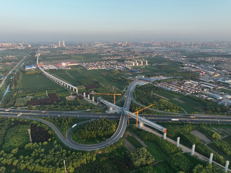 7月18日拍攝的雄忻高鐵保定東特大橋跨京港澳高速連續(xù)梁中跨施工現(xiàn)場(無人機(jī)照片)。
