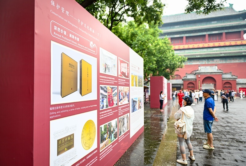7月27日,人們?cè)诒本╃姽臉菑V場(chǎng)上觀看介紹北京中軸線申遺成功一周年成果的展板。