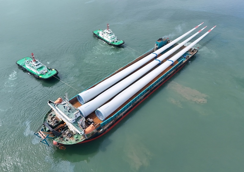 8月1日,三支超大尺寸海上風(fēng)力發(fā)電機(jī)試驗葉片在山東港口煙臺港蓬萊港區(qū)完成裝船并運(yùn)往試驗基地。該型葉片長達(dá)153米,重83.5噸,屬于150米級超大尺寸海上風(fēng)電葉片,現(xiàn)已完成全部靜力測試,即將在試驗基地進(jìn)行疲勞測試驗證。
