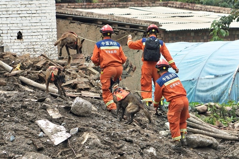 8月9日,甘肅省森林消防總隊(duì)消防員在榆中縣馬坡鄉(xiāng)舊莊溝村利用搜救犬搜救。