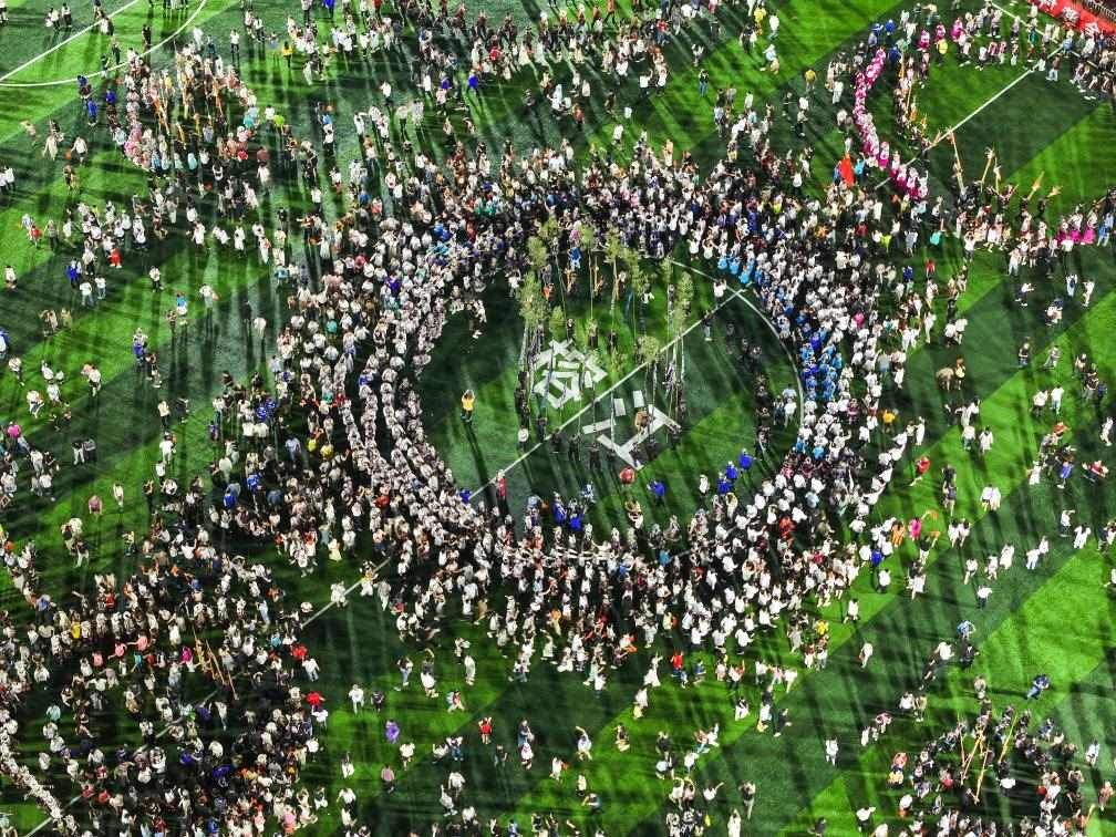 8月23日,人們?cè)谫F州“村超”球場(chǎng)跳苗族蘆笙舞(無(wú)人機(jī)照片)。新華社記者 楊文斌 攝