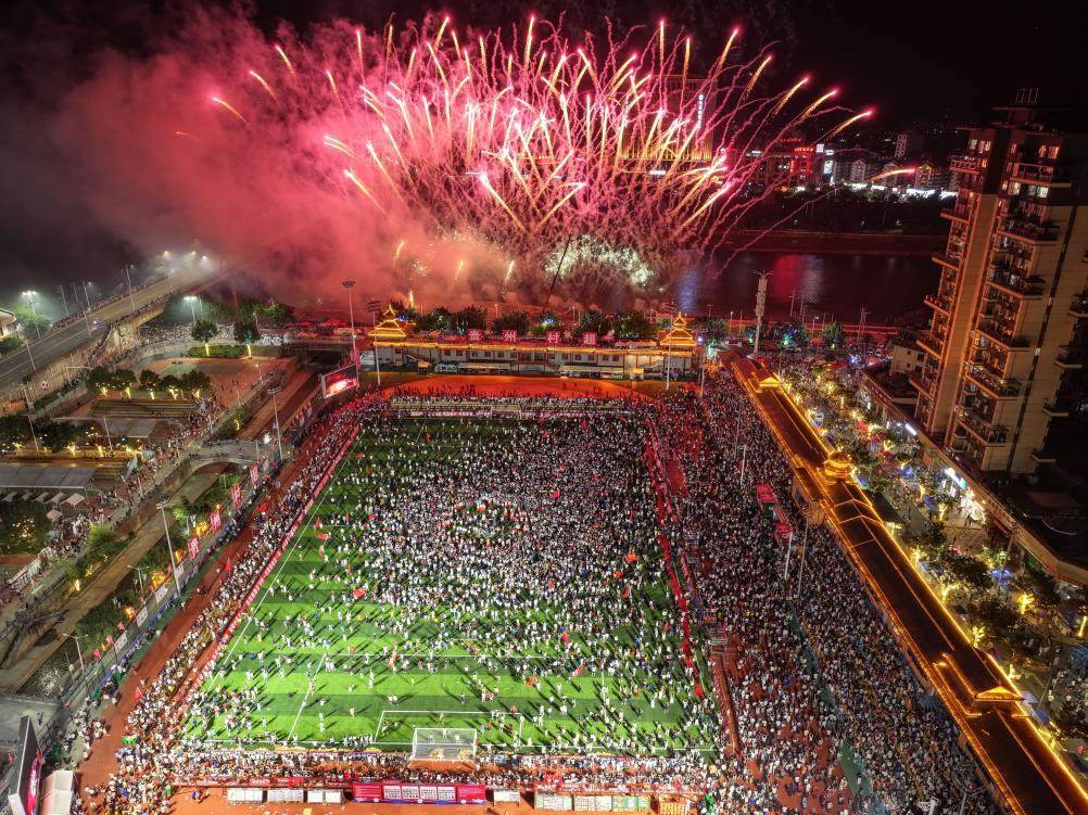 7月26日,貴州“村超”球場拍攝的煙花秀(無人機(jī)照片)。當(dāng)日,貴州榕江舉行主題為“感恩重啟·貴州超力量”的超級星期六活動(dòng),球星巴喬、卡洛斯現(xiàn)場助陣,助力“村超”重燃賽事,正式回歸。新華社記者 楊文斌 攝