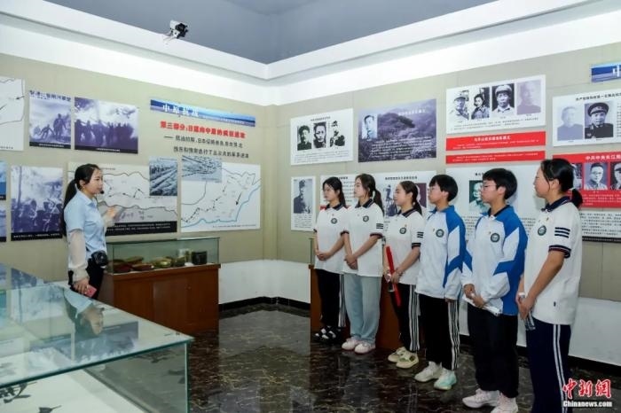 學(xué)生在漯河中州抗戰(zhàn)紀(jì)念館聆聽抗戰(zhàn)史。程耀旗 攝