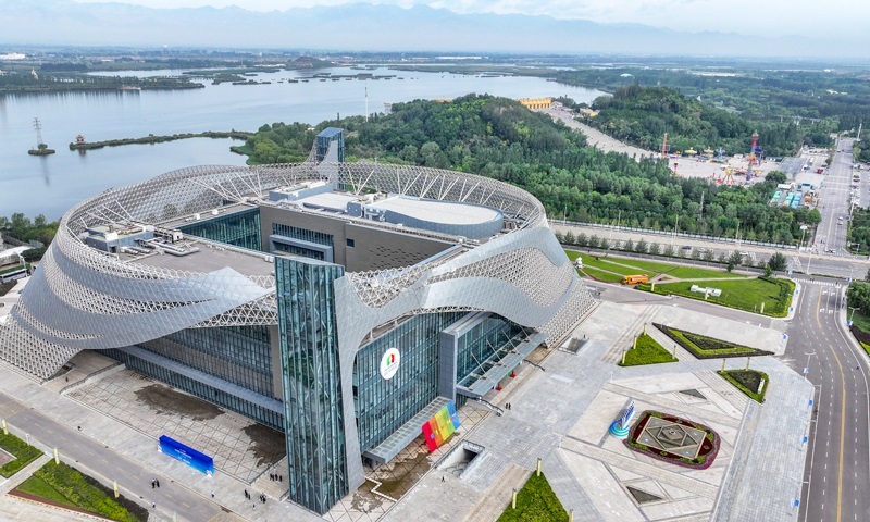 這是8月28日在寧夏銀川市拍攝的第七屆中國—阿拉伯國家博覽會開幕式舉辦地——寧夏國際會堂外景(無人機(jī)照片)。
