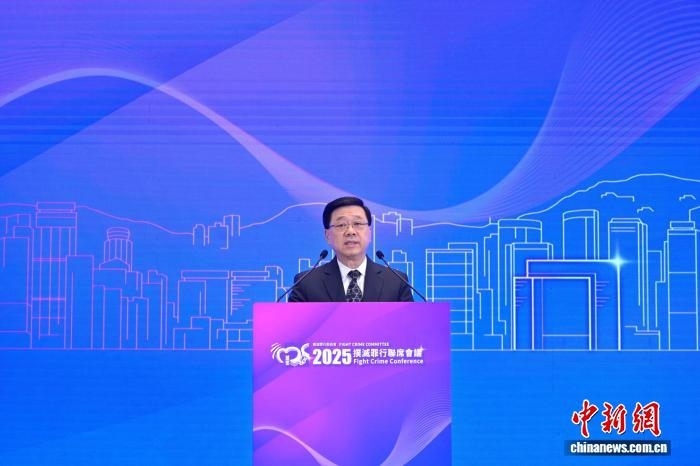 圖為香港特區(qū)行政長官李家超在“2025撲滅罪行聯(lián)席會議”上致辭。 (香港特區(qū)政府新聞處供圖)