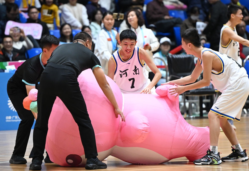 12月14日,河南隊(duì)球員在比賽間隙和吉祥物“樂融融”互動(dòng)。新華社記者 鄧華 攝