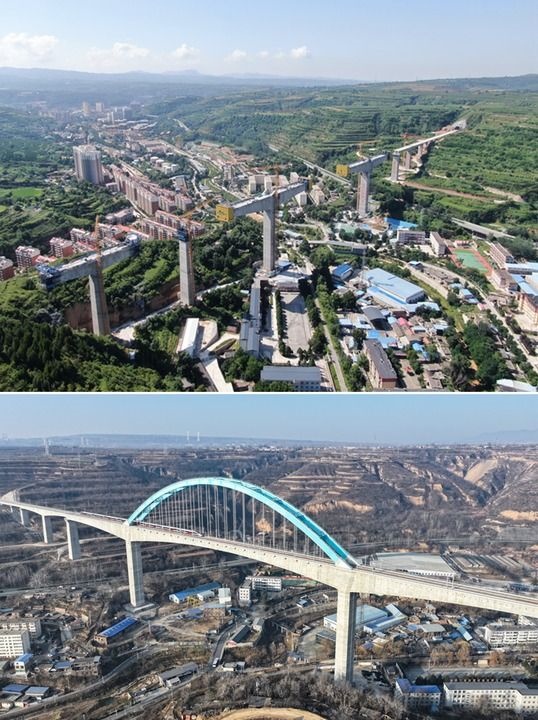 拼版照片:上圖為施工中的西延高鐵王家河特大橋(2023年7月22日攝,無人機(jī)照片);下圖為一列試運(yùn)行列車從西延高鐵王家河特大橋駛過(2025年12月10日攝,無人照片)。新華社記者 張博文 攝