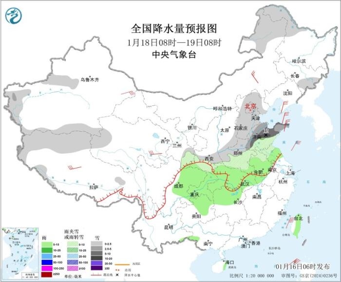 圖1 全國降水量預報圖(1月16日08時-17日08時)。圖片來源:中央氣象臺網站