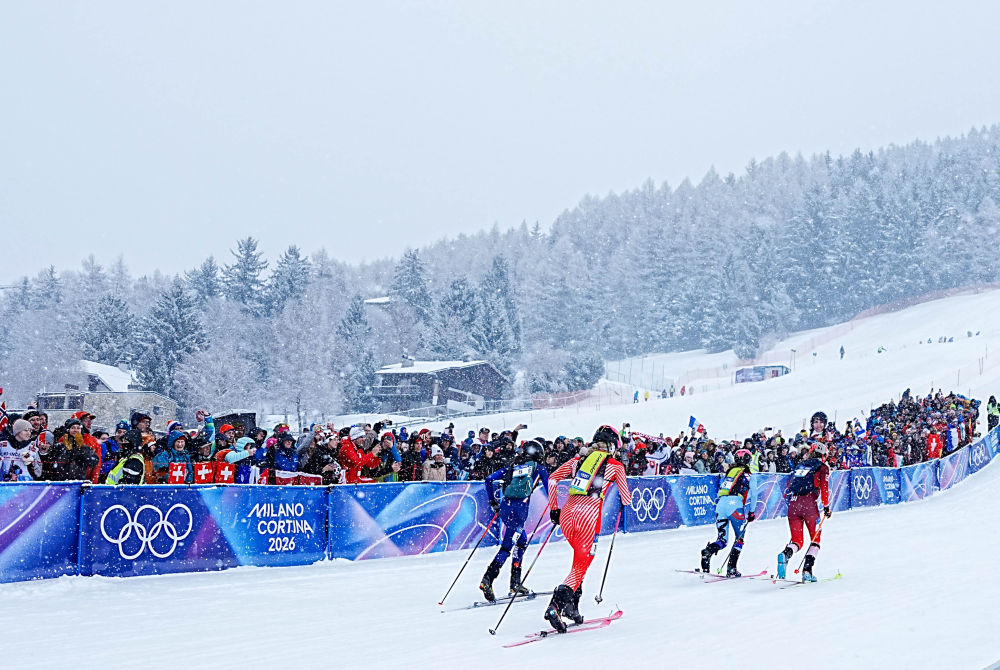 2026年2月19日,運動員在米蘭-科爾蒂納冬奧會滑雪登山比賽中。新華社記者 顏麟蘊 攝