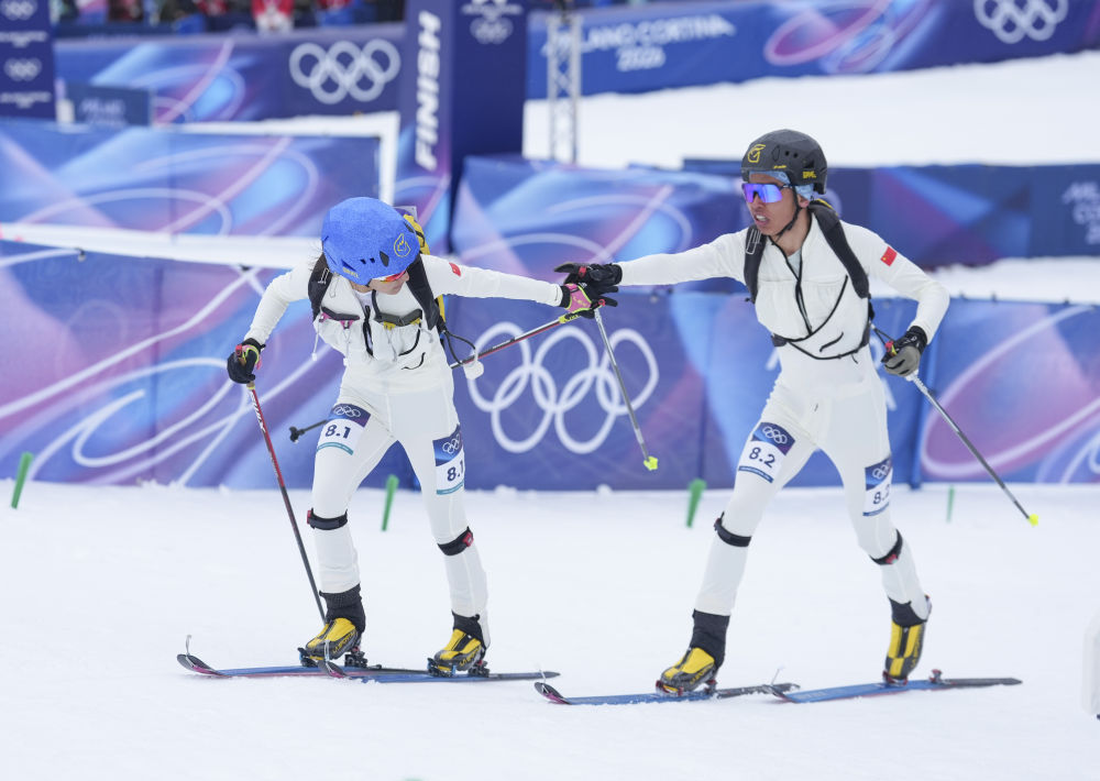 獲得米蘭-科爾蒂納冬奧會滑雪登山混合接力比賽第八名的中國組合次旦玉珍(左)/布魯爾在終點處合影(2026年2月21日攝)。新華社記者 胡虎虎 攝