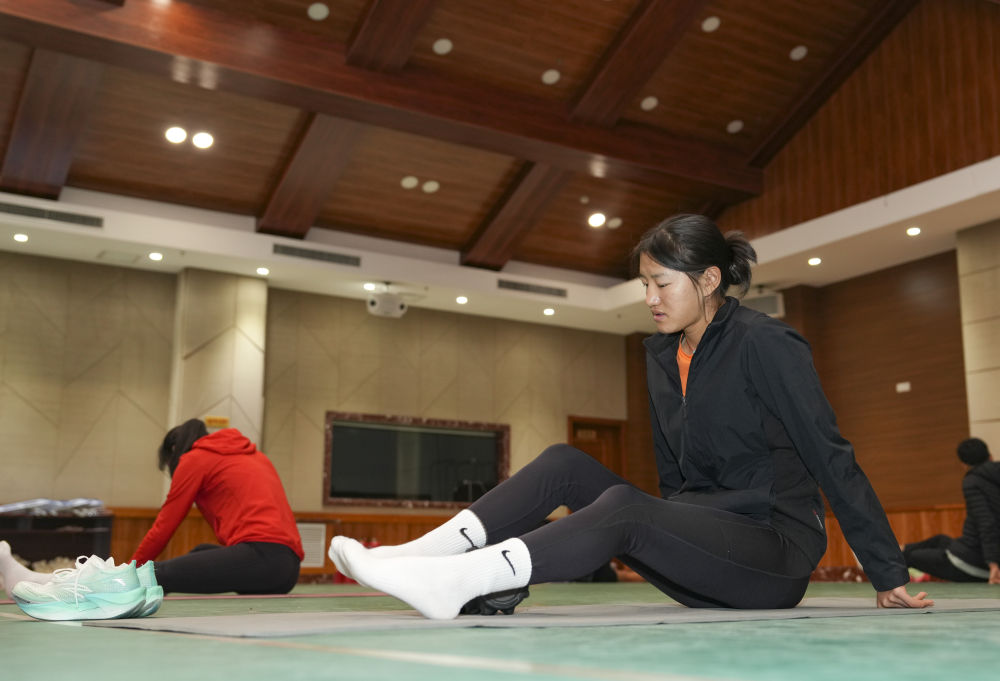 冬奧會前,次旦玉珍在一次訓練后拉伸放松(2025年12月15日攝)。新華社記者 胡虎虎 攝