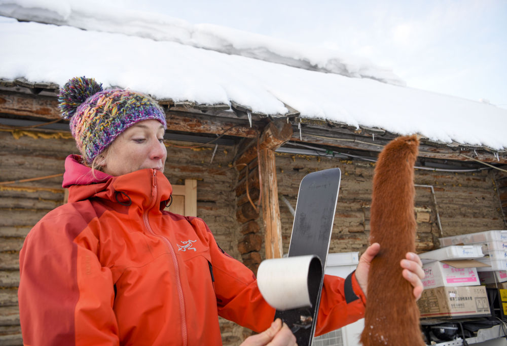 在新疆阿勒泰地區(qū)禾木村,一位法國雪友比較現(xiàn)代滑雪板的止滑帶與古老毛皮滑雪板的異同(2019年1月11日攝)。新華社記者 胡虎虎 攝