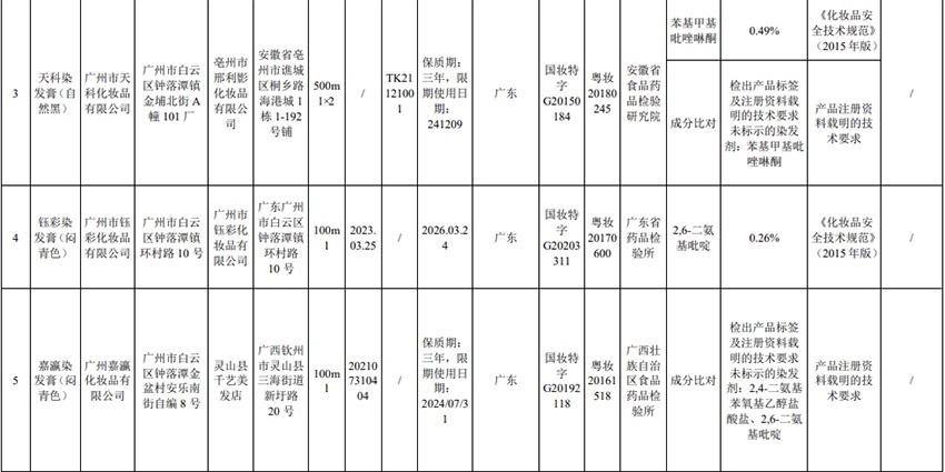 人民網(wǎng)北京9月5日電 (記者孫紅麗)國家藥監(jiān)局近日發(fā)布通告,在2023年國家化妝品抽樣檢驗(yàn)工作中,經(jīng)重慶市食品藥品檢驗(yàn)檢測研究院等單位檢驗(yàn),產(chǎn)品標(biāo)簽標(biāo)示為廣州市天科化妝品有限公司生產(chǎn)的天科染發(fā)膏(自然黑)等23批次化妝品不符合規(guī)定。