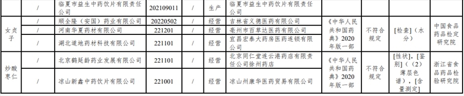 經(jīng)浙江省食品藥品檢驗(yàn)研究院檢驗(yàn),標(biāo)示為北京鶴延齡藥業(yè)發(fā)展有限公司、涼山新鑫中藥飲片有限公司生產(chǎn)的2批次炒酸棗仁不符合規(guī)定,不符合規(guī)定項(xiàng)目包括性狀、鑒別、含量測(cè)定。
