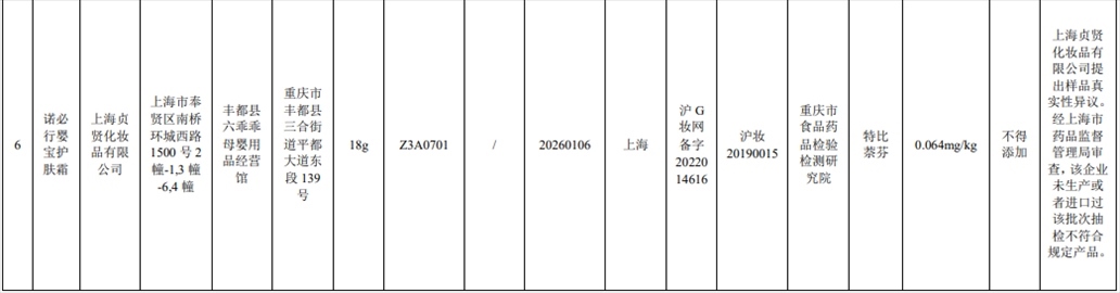 產(chǎn)品標(biāo)簽標(biāo)示為上海貞賢化妝品有限公司生產(chǎn)的諾必行嬰寶護(hù)膚霜檢出不得添加的特比萘芬。(備注:上海貞賢化妝品有限公司提出樣品真實(shí)性異議。經(jīng)上海市藥品監(jiān)督管理局審查,該企業(yè)未生產(chǎn)或者進(jìn)口過(guò)該批次抽檢不符合規(guī)定產(chǎn)品。)