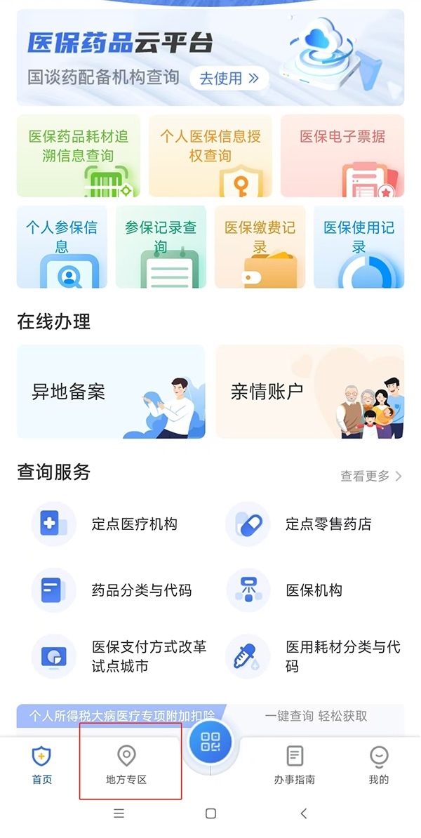 第一步:以北京為例,打開“國家醫(yī)保服務(wù)平臺(tái)”App,點(diǎn)擊進(jìn)入下方“地方專區(qū)”,選擇“北京市”。