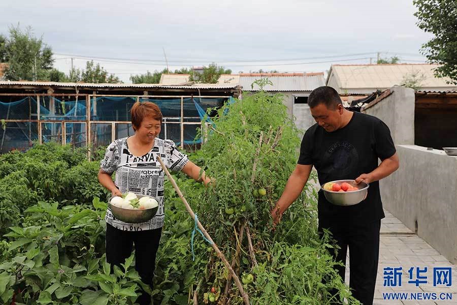 姜玉龍、宋朋艷夫婦在菜園中收獲勞動果實。新華網發(fā)