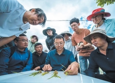 科技創(chuàng)新中國工程院院士張福鎖(中)和科技小院學生、農民一起探討中稻種植技術。趙 渝攝(人民視覺)