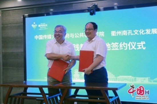 白文剛副院長(zhǎng)與盛雄生主任分別代表中國(guó)傳媒大學(xué)政府與公共事務(wù)學(xué)院和衢州南孔文化發(fā)展中心簽署中國(guó)傳媒大學(xué)(政府與公共事務(wù)學(xué)院)實(shí)習(xí)實(shí)踐教學(xué)基地合作協(xié)議。
