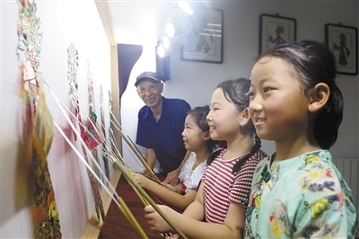 非遺體驗(yàn)河北省唐山市豐潤(rùn)區(qū)浭陽(yáng)街道華府社區(qū)開設(shè)“非遺”小課堂,小朋友們?cè)趯W(xué)習(xí)表演皮影戲。 朱大勇攝(人民視覺)