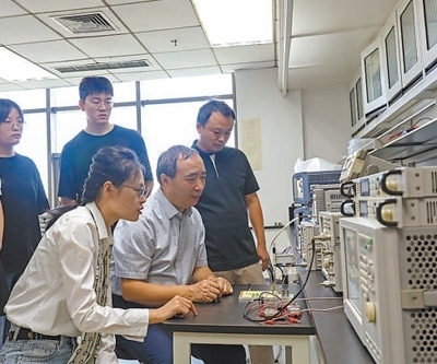 北京郵電大學多頻微波通信技術團隊的劉元安教授(右二)指導學生開展科研工作。唐玉嬋攝(人民視覺)