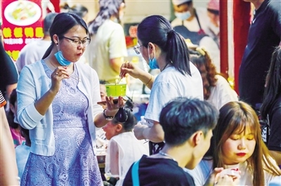 6月7日正值周日,夜幕還未降臨,大召廣場上已經(jīng)聚集了不少消遣的市民,他們當(dāng)中有六七十歲的老人,也有二三十歲的青年,還有牽著父母手的孩童。隨著時間的推移,廣場上的人越來越多,而緊挨著廣場的通順大巷更是人頭攢動,吆喝聲、叫賣聲、談笑聲、音樂聲混在一起,形成了夏季獨有的市井之聲。街上,從本地的稀果羹、羊肉串、烤面筋到北京爆肚、武漢臭豆腐可謂應(yīng)有盡有,家家戶戶的門前都或多或少的有市民排隊等候。