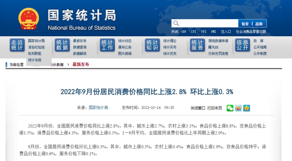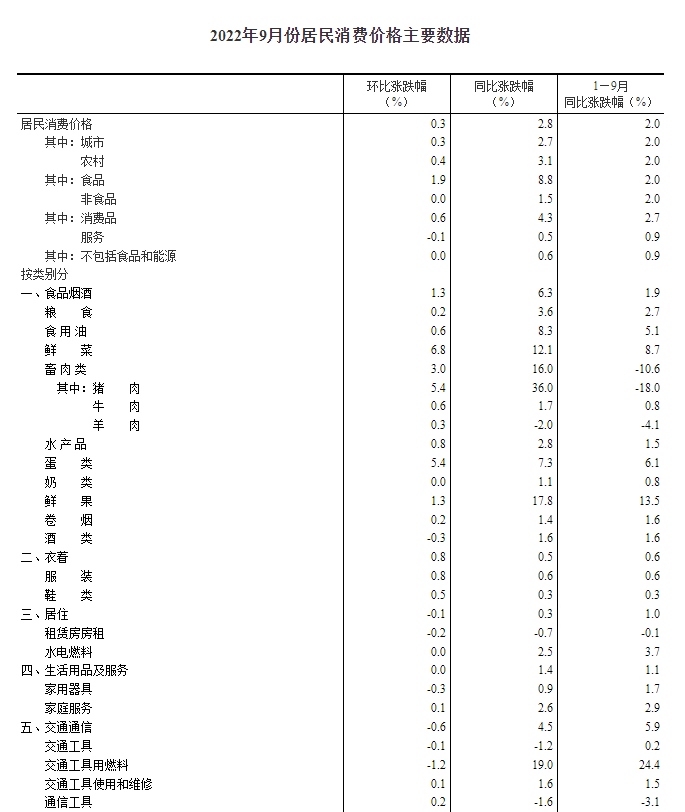 2022年9月份,全國居民消費價格同比上漲2.8%。其中,城市上漲2.7%,農(nóng)村上漲3.1%;食品價格上漲8.8%,非食品價格上漲1.5%;消費品價格上漲4.3%,服務(wù)價格上漲0.5%。1--—9月平均,全國居民消費價格比上年同期上漲2.0%。