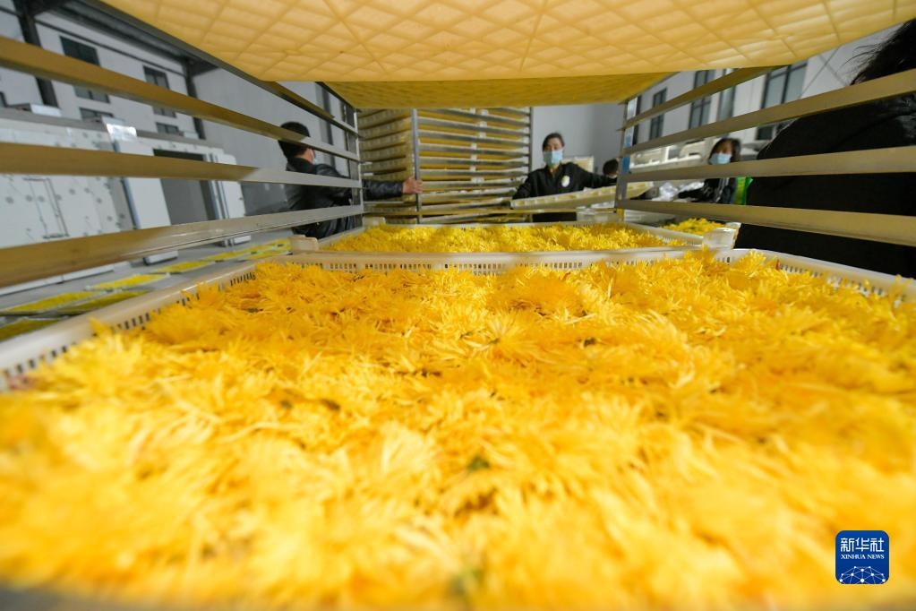 10月20日,村民在貴州省貴定縣云霧鎮(zhèn)一家菊花加工車間攤晾金絲皇菊。新華社記者 楊文斌 攝