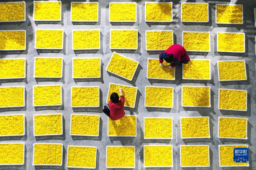 金秋時節(jié),貴州省黔南布依族苗族自治州貴定縣云霧鎮(zhèn)種植的1000余畝菊花陸續(xù)進入采摘期,當?shù)卮迕衩χ烧?、分揀、烘干菊花,供?yīng)市場。
