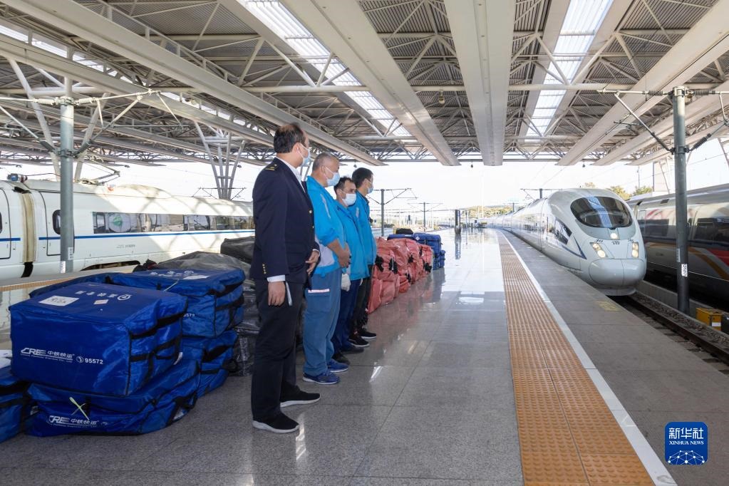11月1日,在G1373次列車上,鐵路工作人員搬運(yùn)貨物。新華社記者 王翔 攝