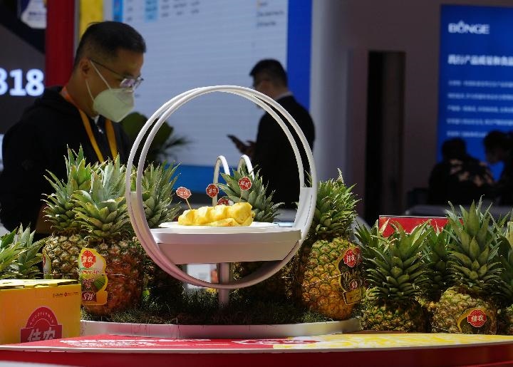 11月5日在第五屆進博會食品及農產品展區(qū)拍攝的菲律賓黑鉆鳳梨。新華社記者 劉穎 攝