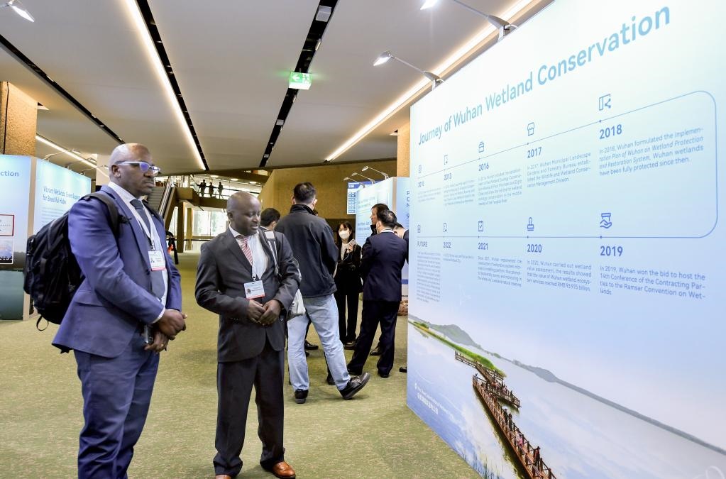 2022年11月5日,在瑞士日內(nèi)瓦,與會(huì)嘉賓在《濕地公約》第十四屆締約方大會(huì)日內(nèi)瓦會(huì)場(chǎng)中國(guó)展區(qū)參觀。新華社記者連漪攝
