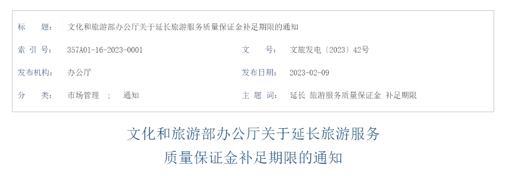 文化和旅游部辦公廳日前發(fā)布通知延長旅游服務(wù)質(zhì)量保證金補足期限。通知提出,按照《文化和旅游部辦公廳關(guān)于進(jìn)一步調(diào)整暫退旅游服務(wù)質(zhì)量保證金相關(guān)政策的通知》(文旅發(fā)電〔2022〕61號)要求享受暫退或暫緩交納保證金政策的旅行社,補足保證金期限延至2024年3月31日。
