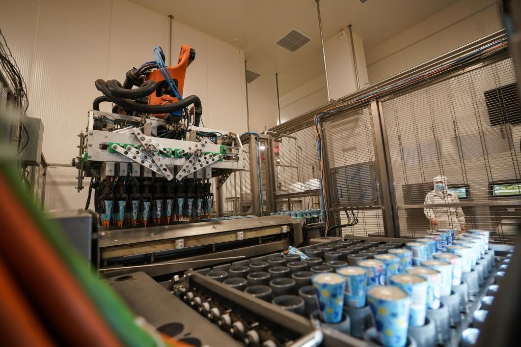 位于江蘇蘇州太倉的聯合利華和路雪生產基地,于2021年9月獲評全球“燈塔工廠”,成為當地“智能制造”的標桿。工廠里,機器人正將產品轉移到速凍隧道。新華社記者 季春鵬 攝