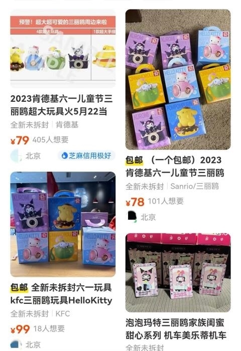 在某二手平臺,肯德基此次發(fā)售的三麗鷗玩具,標(biāo)價集中在70元至100元之間,比69.9元的兒童節(jié)套餐價格更貴。麥當(dāng)勞俄羅斯方塊游戲機的價格多在40元至60元之間。