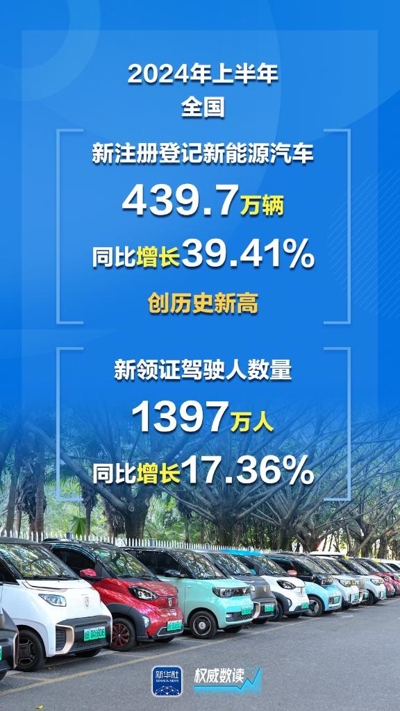 公安部7月8日發(fā)布最新統(tǒng)計(jì)數(shù)據(jù),截至2024年6月底,全國(guó)機(jī)動(dòng)車保有量達(dá)4.4億輛,機(jī)動(dòng)車駕駛?cè)?.32億人;上半年新注冊(cè)登記新能源汽車439.7萬輛,同比增長(zhǎng)39.41%,創(chuàng)歷史新高;上半年全國(guó)新領(lǐng)證駕駛?cè)藬?shù)量1397萬人。