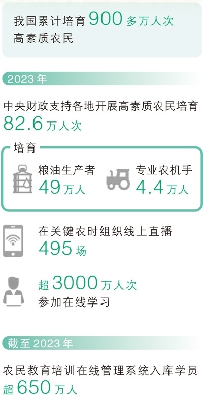 放眼沃野田疇,像高興一樣的高素質(zhì)農(nóng)民還有很多。2023年,中央財政支持各地開展高素質(zhì)農(nóng)民培育82.6萬人次,聚焦主要糧油作物開展全產(chǎn)業(yè)鏈技術(shù)培訓,全年培育糧油生產(chǎn)者49萬人、專業(yè)農(nóng)機手4.4萬人,舉辦大豆玉米帶狀復合種植技術(shù)培訓1076個班次,培訓人數(shù)6.3萬。在春耕、“三夏”、秋收等關鍵農(nóng)時組織線上直播495場,超過3000萬人次參加了在線學習。