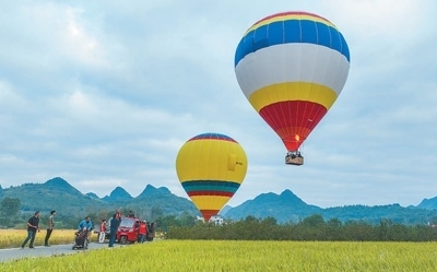 10月6日,湖南寧遠(yuǎn)縣灣井鎮(zhèn)十里畫(huà)廊,游客乘坐熱氣球觀(guān)賞田園美景。蔣克青攝(人民視覺(jué))