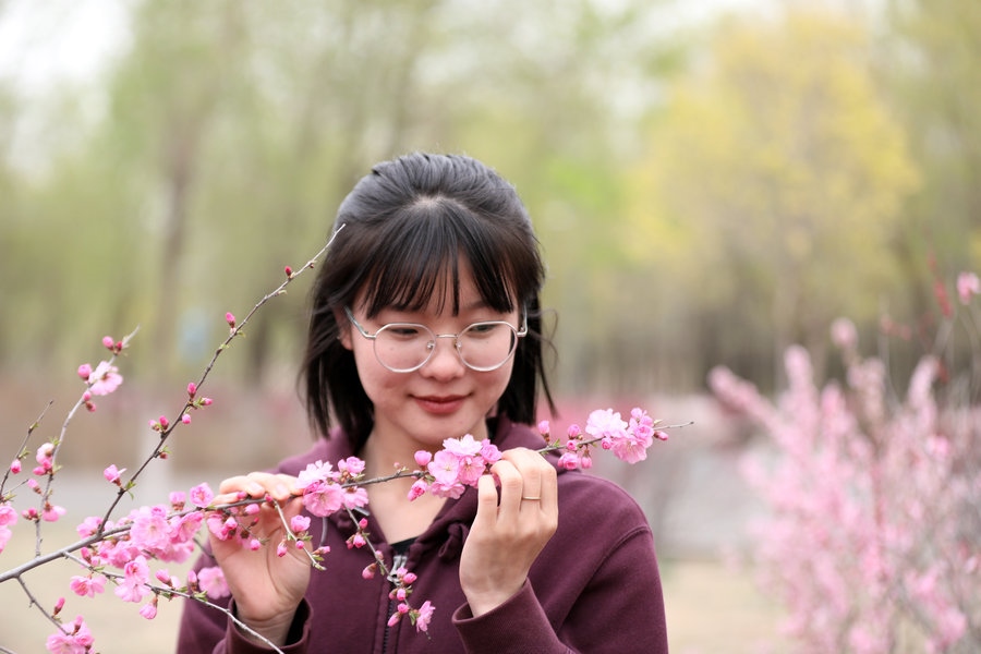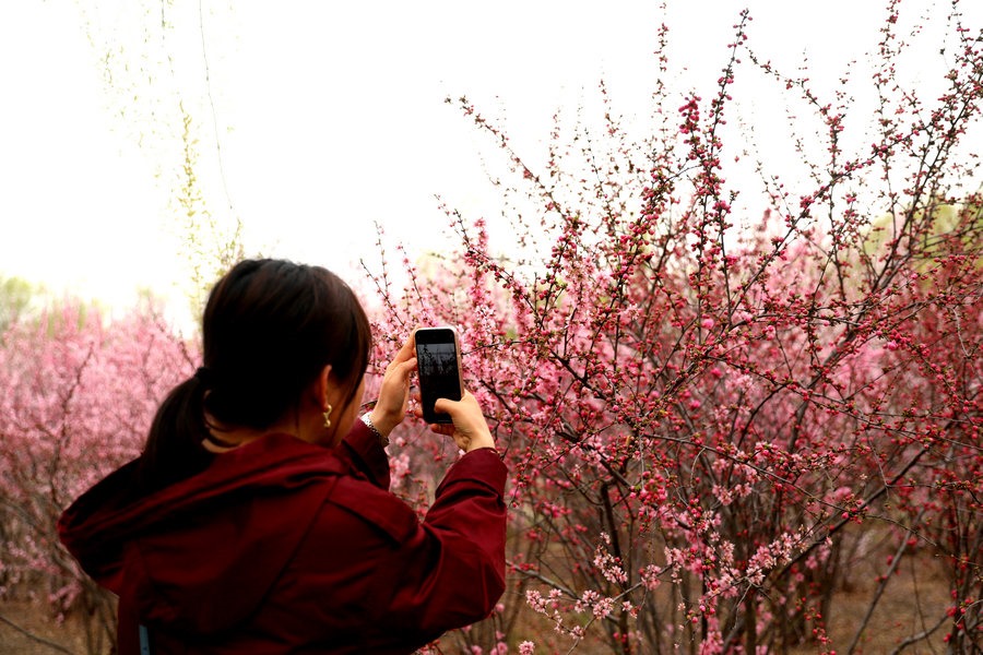 4月27日,呼和浩特南湖濕地公園的榆葉梅盛開,游客紛紛來(lái)此拍照打卡。