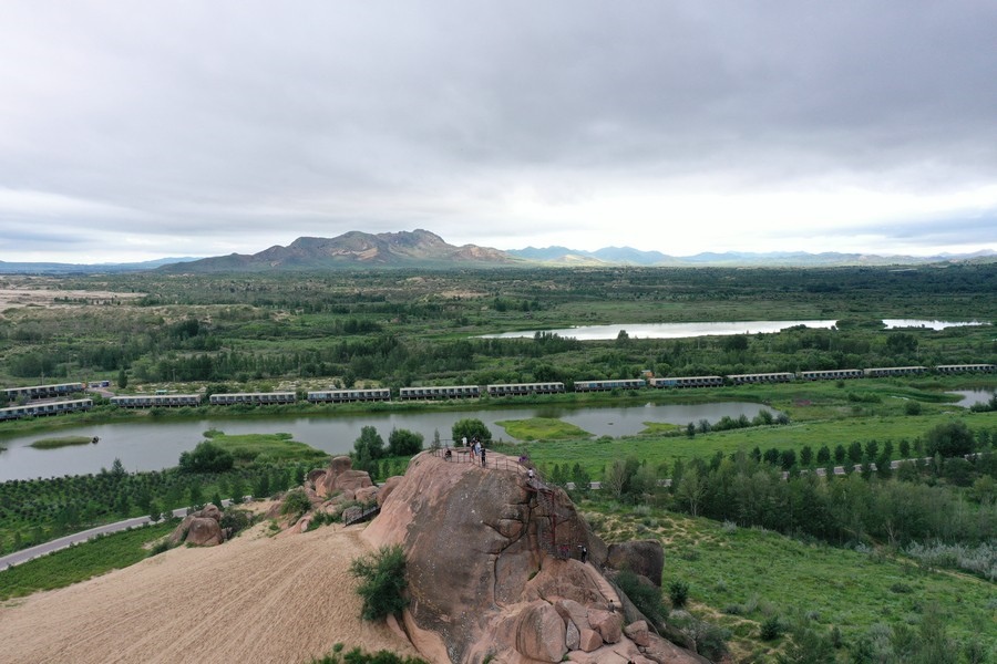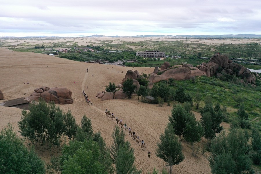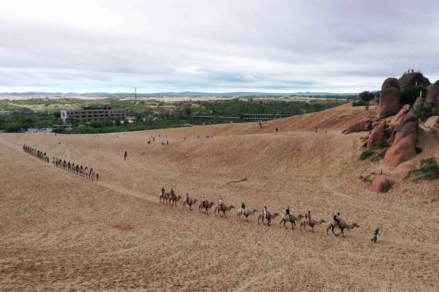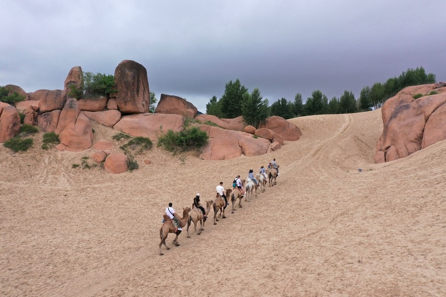7月31日,雨后的玉龍沙湖空氣清新,游客在玉龍沙湖景區(qū)越野穿沙、騎駱駝?dòng)瓮?,欣賞沙海奇觀。