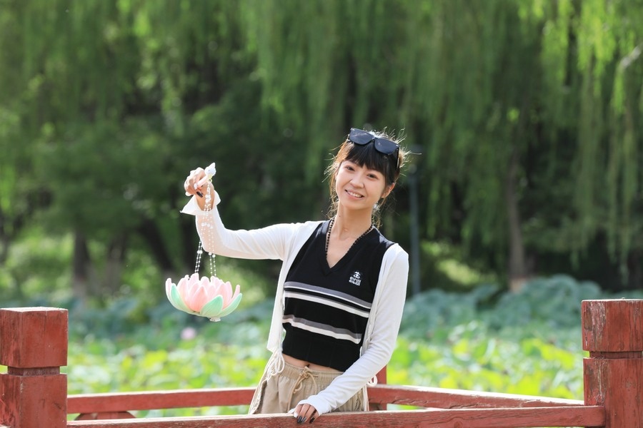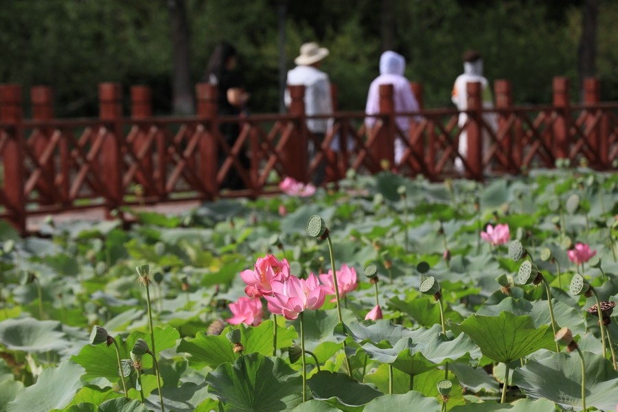 初秋時(shí)節(jié),水光瀲滟間,公園內(nèi)的滿池荷花嬌艷、荷葉青翠,漫步棧道中,仿佛置身于一幅詩意的畫卷。
