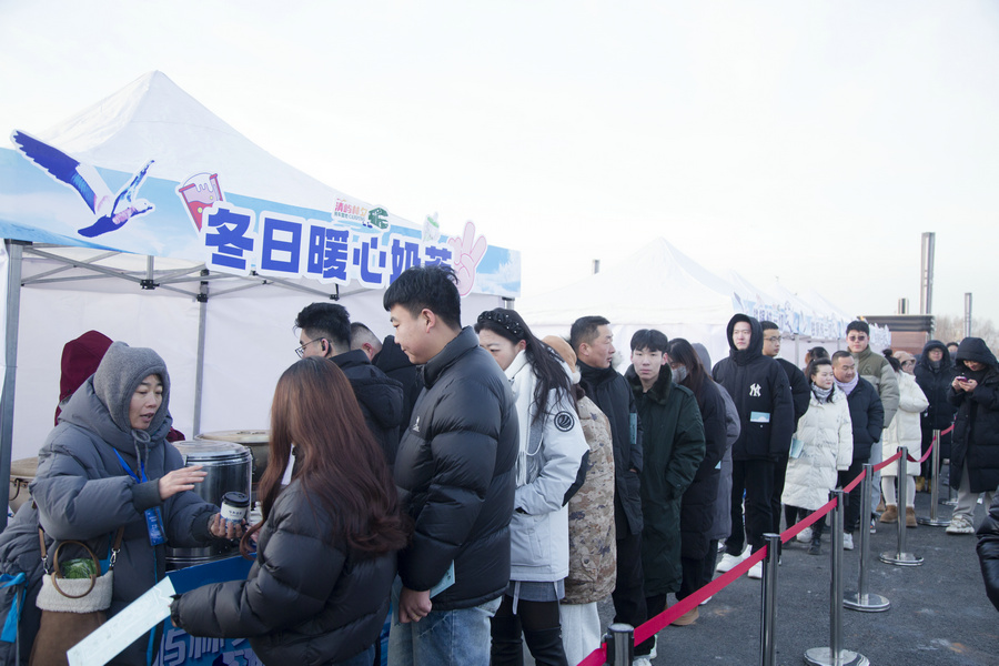 1月4日清晨,房車營地內(nèi)的暖冬造趣節(jié)現(xiàn)場游客在排隊領(lǐng)取免費奶茶