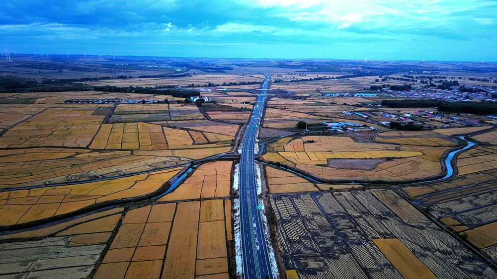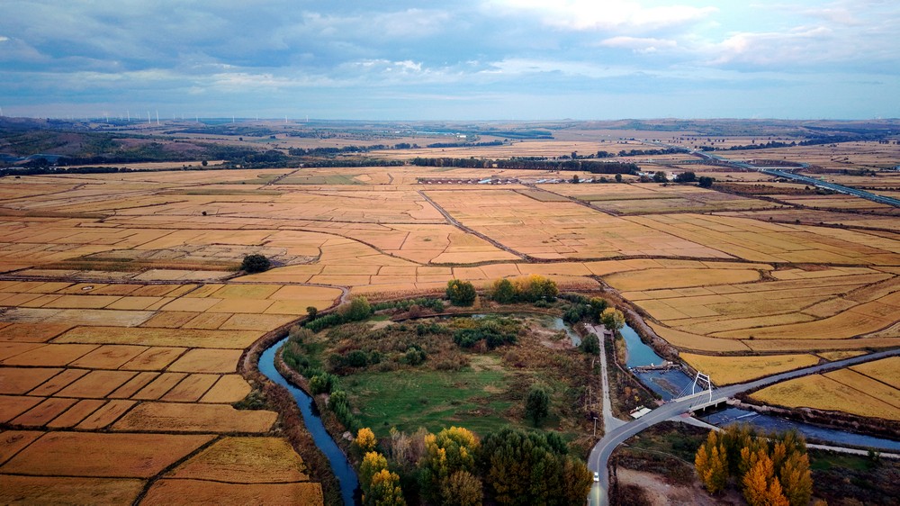 9月25日,空中俯瞰暮色中的三合村,遠(yuǎn)山如黛,稻田如畫(huà),金色的麥浪,映襯著豐收的底色。