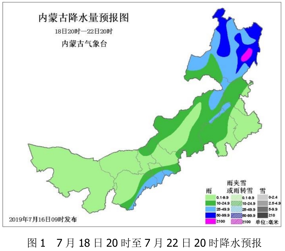 具體預(yù)報(bào)如下:7月18日20時(shí)至22日20時(shí),全區(qū)大部有降水,累積降水量0.1~9.9毫米;鄂爾多斯市東部、包頭市東南部和北部、呼和浩特市中南部、烏蘭察布市南部、錫林郭勒盟東部、北部和南部、赤峰市西部和北部、通遼市北部、興安盟大部、呼倫貝爾市大部累積降水量10~24.9毫米;鄂爾多斯市東北部、呼和浩特市南部、烏蘭察布市西南部、錫林郭勒盟東北部、赤峰市北部部分地區(qū)、通遼市北部部分地區(qū)、興安盟西北部部分地區(qū)、呼倫貝爾市大部累積降水量 25~49.9毫米;呼倫貝爾市北部和東部部分地區(qū)累積降水量50~99.9毫米,呼倫貝爾市東部偏南部分地區(qū)累積降水量 100毫米以上(見(jiàn)圖 1)。