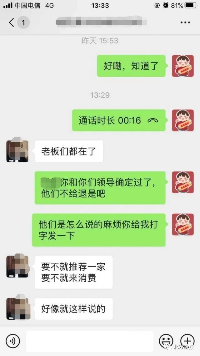 高先生提供給記者的一份微信聊天記錄顯示,當高先生提出退還押金的要求時,白泉山莊海世盛宴的工作人員告知,要不就推薦其他人到這里舉辦婚禮,要不就來這里消費以抵消押金??傊?,押金是不能退的。