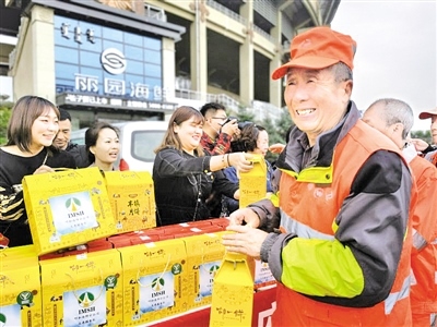 領到月餅的環(huán)衛(wèi)工人喜笑顏開 攝影/梁良